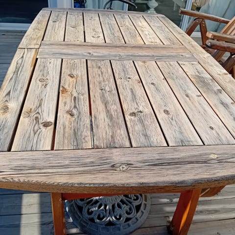 Rektangulärt trädgårdsbord i trä. Bordet har ribbad bordsskiva och stabila ben med stag. Passar för utomhusbruk på altan, uteplats eller i trädgård. Färg och ytfinish är väderpåverkad vilket ger en naturligt grånad träyta.