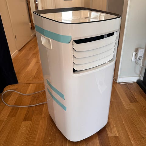 Pro Klima portabel luftkonditionering i vit och svart färg. Enheten är golvstående och ansluts med medföljande slang för frånluft genom fönster eller vägg. Ovanpå finns digital display och kontrollpanel med knappar för olika lägen såsom kyla, avfuktning, fläkt och timerfunktion. Passar för inomhusbruk i bostad eller kontor där flyttbar kylning önskas. Strömkabel och hjul på undersidan underlättar placering i rummet.77 cm hög. Djup utan slang 37 cm. bredd 31 cm. Slang ca 150 cm
