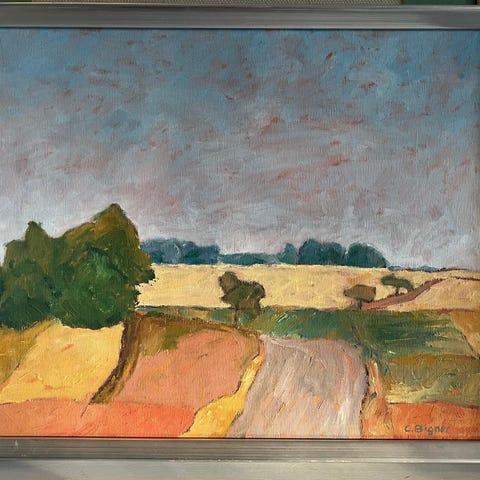 Tavla med motivet föreställande ett stiliserat, öppet landskap med ett naket träd. Målningen går i dämpade, ljusa toner av grönt, beige och grått.