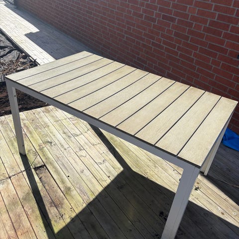 Fällbart matbord i teak. Bordet har rektangulär bordsskiva med ribbade partier och kan fällas ihop för att ta mindre plats vid förvaring. Passar exempelvis på balkong, altan eller mindre utrymmen där ett flexibelt bord behövs.