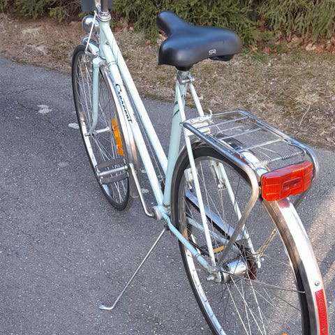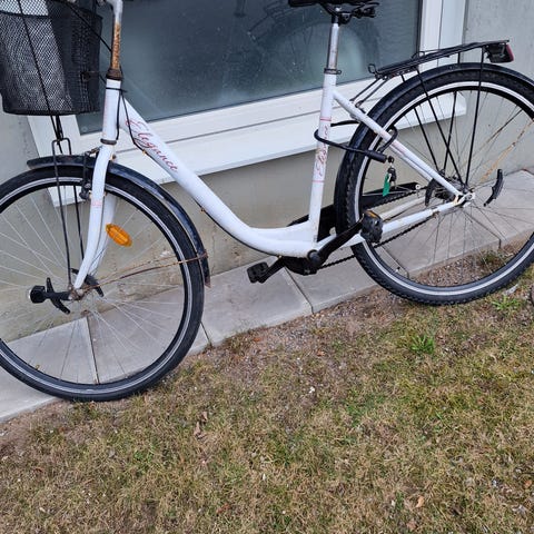 DBS damcykel med ramstorlek 51 cm och 28" hjul. Cykeln har lågt insteg, pakethållare bak och korg fram. Utrustad med handbroms och växelreglage på styret med 3 st nav växlar. Allt funkar utan problem och den är nyligen servad.