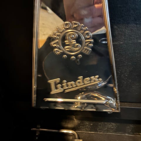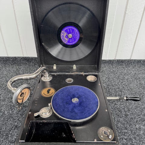 Odeonette II portabel grammofon i röd koffert. Mekanisk vevgrammofon med inbyggt handtag för transport. Skivspelaren har tallrik, tonarm och nålfäste samt fack för tillbehör i kofferten. Utsidan och insidan är klädd i rött material med kontrastsömmar. Passar för uppspelning av äldre stenkakor/78-varvsskivor där sådan funktion finns bevarad.