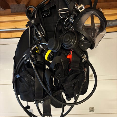 Fenor strl 44 och mask från Cressi samt en dygbag med plats för bla fenor, mask mm. Fenorna och masken märkta med säljarens initialer.