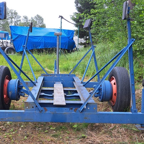 Karlsvik Marin båtvagn i blåmålat stål. Kraftig ramkonstruktion med dragögla framtill och stödben. Anpassad för transport och förvaring av båt på land. Utrustad med dubbelaxel med hjul bak för stabilitet vid förflyttning. Lämplig för marin miljö och användning vid varv eller båtförvaring.