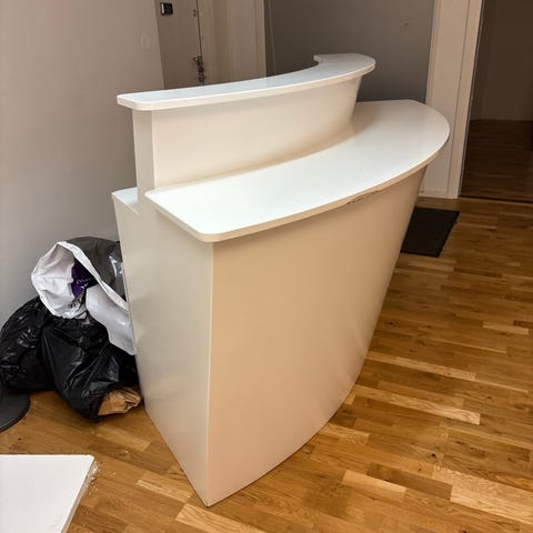 Receptionsdisk i vit färg med svart bänkskiva. Framsidan har Wella Company-logotyp och en öppen hyllsektion med två glashyllor för exponering eller förvaring. Framsidan går att ändra färg, sätta dit akustikpanel osv. Går även att kortas ner då glaspartidelen är separat och ditsatt i efterhand. Baksidan har skåp- och lådförvaring samt plats för kassasystem eller dator. Passar exempelvis frisörsalong, skönhetssalong eller butik som receptions- eller kassadisk. Hör av er vid seriöst intresse. Hämtas på plats i Gamla stan i Eskilstuna.