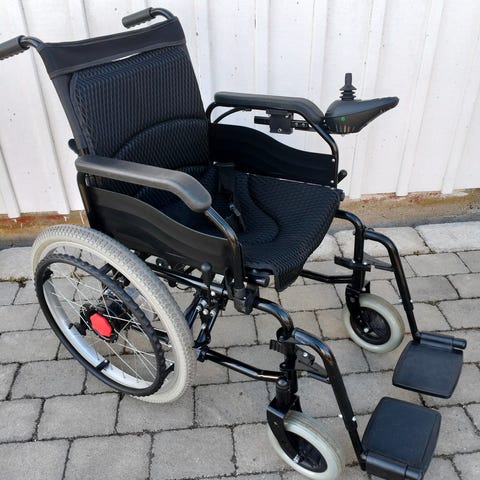 Vikbar batteridriven rullstol med joystick, vikt 27 kg.