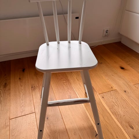IKEA INGOLF juniorstol i vitlackat trä. Stolen har hög sitthöjd anpassad för barn vid matbord, med kryssryggstöd och fotstöd för extra stabilitet.