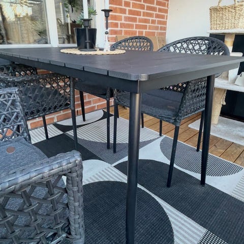 Fyrkantigt utebord med skiva i svart träimitation och underrede i mörk metall.