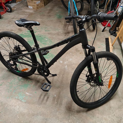 Barncykel mountainbike med 26" hjul i svart utförande. Cykeln har framgaffel med dämpning, grovmönstrade däck och handbromsar fram och bak. Utrustad med växlar och sadel anpassad för barn/ungdom. Passar för cykling på både grusvägar, enklare stigar och i cyckelparker/skog. Det är en ocano cyckel som är firma lackerad till matt svart