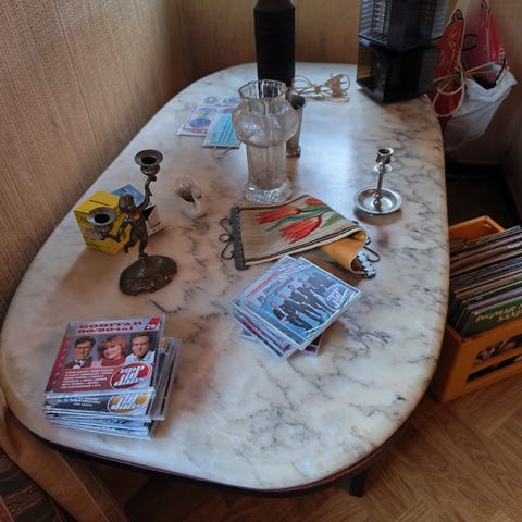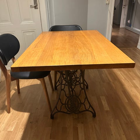 Sidobord med stenskiva, underredet är ett gammalt symaskins underrede från märket Singer.