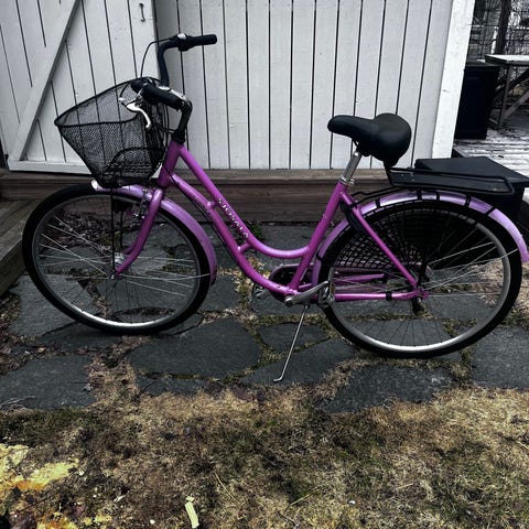 Barncykel med 24" hjul i lila färg. Utrustad med pakethållare, skärmar, stöd och handbroms fram. Ej använd på 2 år