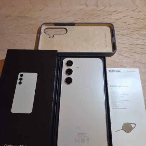 Säljer denna Samsung Galaxy S24 smartphone med 128 GB internminne. Telefonen har en svart baksida med trippelkamera och LED-blixt. Den är i bra skick.