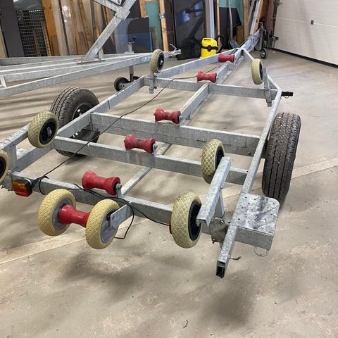 Respo båtvagn 1400kg i galvaniserat stål. Utrustad med flera kölrullar och sidostöd för stabil lastning av båt. Vagnen har vinsch fram och stödhjul i fronten. Konstruktionen är öppen med kraftig ram anpassad för transport och sjösättning av båt. Galvaniserad yta ger skydd mot rost och slitage vid användning i marin miljö.