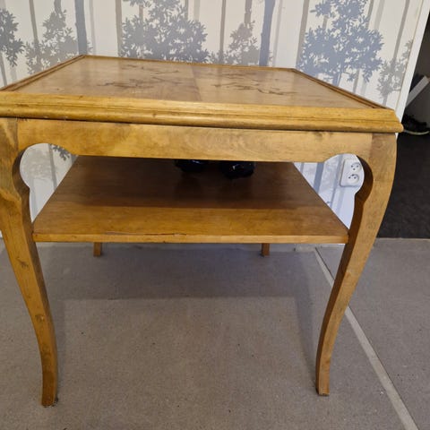 Sekretär skrivbord i trä med brun faner. Utdragbar skrivskiva och flera små lådor och fack invändigt för förvaring av papper och mindre föremål. Framsidan har dekorativ intarsia och möbeln står på svängda ben. Passar som arbetsplats eller förvaringsmöbel i vardagsrum, sovrum eller hall.