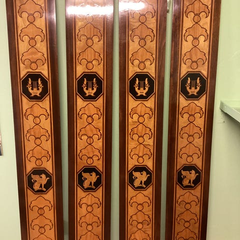 Kvadratiskt soffbord i trä med dekorativt intarsiamönster på bordsskivan. Bordet har profilerade ben och en praktisk underhylla för förvaring eller dekoration. Passar som soffbord eller sidobord i vardagsrum eller sällskapsrum.