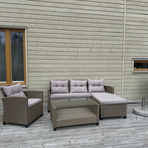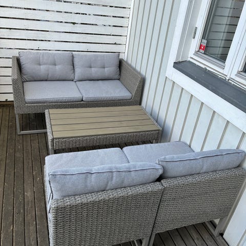 Ikea soffgrupp av tålig plast. Gruppen består av en tvåsitssoffa, två fåtöljer samt ett bord. Möbelgruppen är för uteplats, altan eller balkong och har en struktur som liknar flätad konstrotting. Inom- och utomhus.