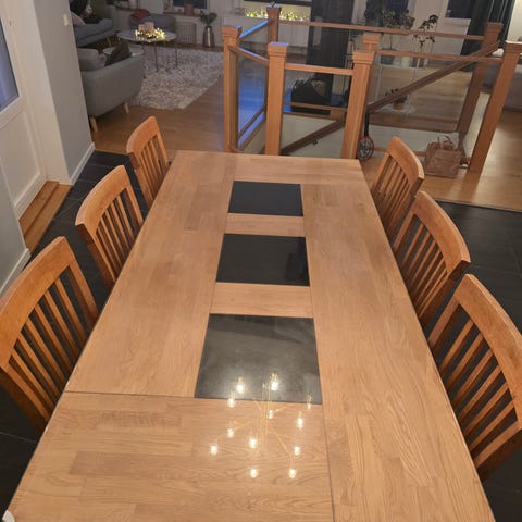 Matbord med dubbla iläggskivor (förvaras i bordet). Kan bli 3 meter långt eller 2,5. Säljes med 6 stolar i fint skick samt 4 stolar som är nötta. Bordet har tyvärr sprickor på ena hörnan (se nytagen bild) samt på mitten. Kan användas användas som det är eller med duk. Ytan väldigt värmetålig. Slumpas bort då det har sprickor och är för stort.