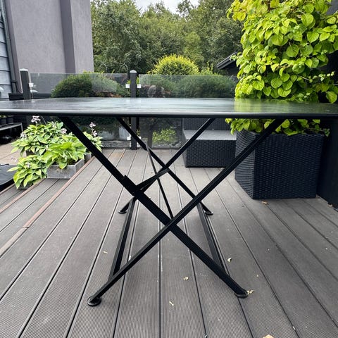Matbord för utomhusbruk med rektangulär bordsskiva i glas och svart underrede i flätad design. Passar på balkong, altan eller uteplats. Bordet har fyra ben som är sammanbundna med en stabiliserande del under bordsskivan.