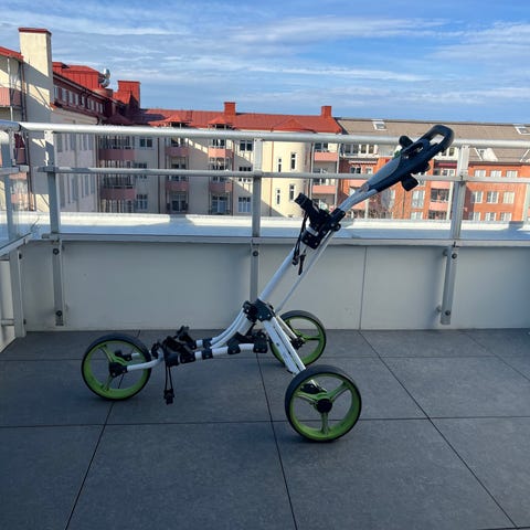 Axglo golfvagn med fyra hjul i svart utförande. Vagnen är hopfällbar för enklare transport och förvaring. Utrustad med handtag, hållare för scorekort och tillbehör samt stabil ram för golfbag. Passar för användning på golfbanan för transport av golfbag och utrustning.