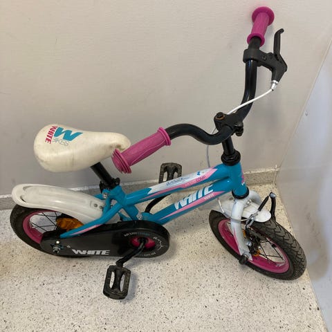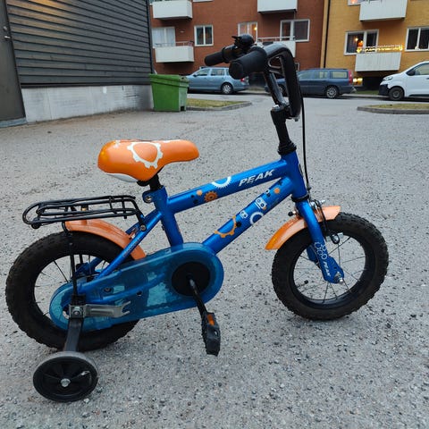 Peak barncykel med 12" hjul i svart färg. Cykeln har ram anpassad för barn och är utrustad med grovmönstrade däck, fotbroms bak och handbroms fram. Modellen har framgaffel med fjädring samt reflexer på hjul och pedaler.