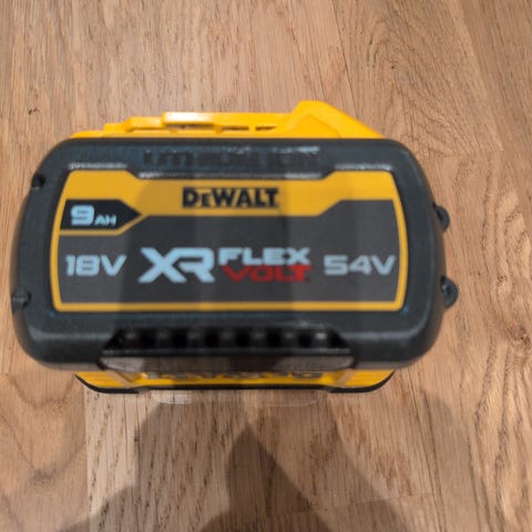 DeWalt XR FlexVolt batteri för elverktyg. Batteriet har kapacitet på 9Ah och kan användas i både 18V- och 54V-system enligt märkning på batteriet. Färg gul/svart. Utrustat med indikator för laddningsnivå på ovansidan. Passar DeWalt-maskiner som är kompatibla med XR FlexVolt-batterier.