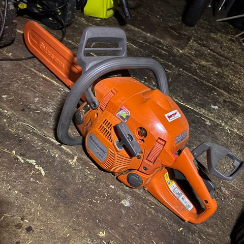 En Husqvarna proffssåg. 13 tums svärd. Lite trögstartad men rapp när man kör. Extra skydd med Triobrake så att man jobbar rätt med sågen. Utrustad med handtagsvärme. Nästan nytt svärd.