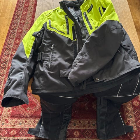 Jackan är försedd med vadderade partier över axlar och armbågar samt flera fickor med dragkedja. Köpte till ett större löst Richa D30 Stealth Viper ryggskydd i orange plast/skum som ökar tryggheten när man är ute på vägarna.