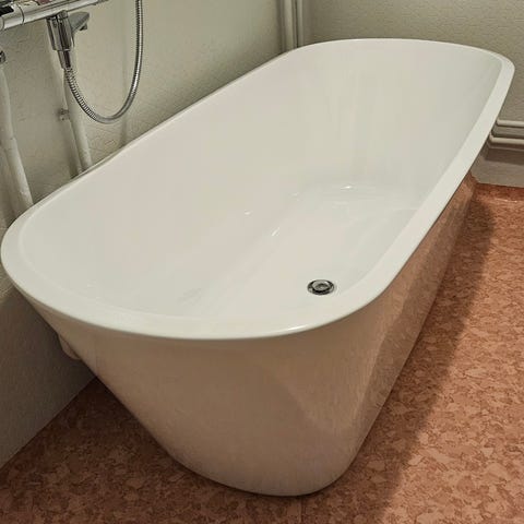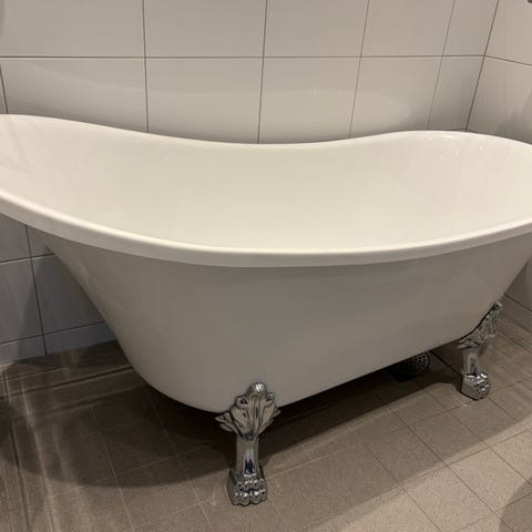 Fristående badkar med lejontassar. Material akryl.