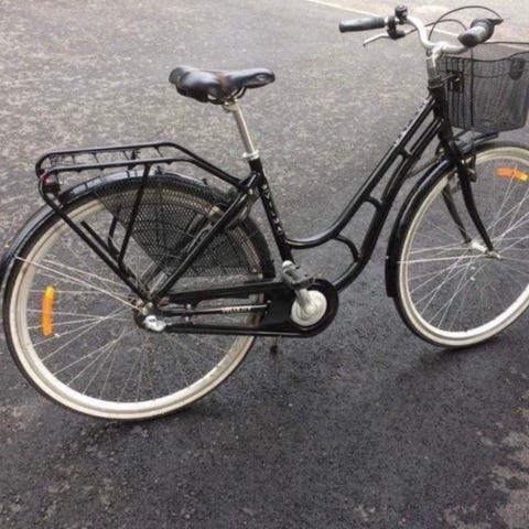 Svart damcykel 28 tum med korg märket Vilma. Tre växlar funkar ok