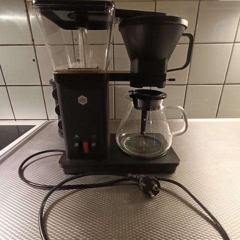 OBH Nordica kaffebryggare med glaskanna i svart och vitt utförande. Bryggaren har en separat vattenbehållare, filterhållare och värmeplatta. Glaskannan har handtag i plast och lock med hällpip. Passar för bryggning av flera koppar kaffe åt gången i hem- eller kontorsmiljö.