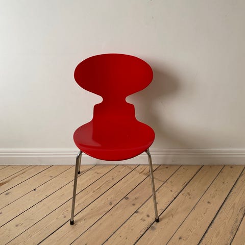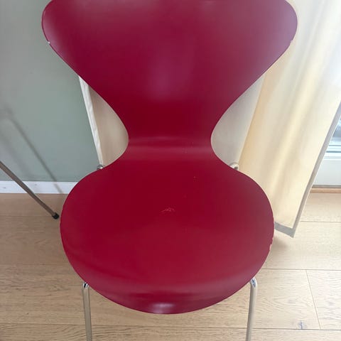 Fritz Hansen Serie 7 stol formgiven av Arne Jacobsen. Sits och rygg i rött fanér med kromade metallben. Stapelbar modell som kan användas som matstol, skrivbordsstol eller extra sittplats i hem- eller kontorsmiljö. Bilderna visar även mindre märken och slitage på sitsens kanter.