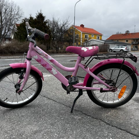 Barncykel med 16" hjul i rosa färg. Cykeln har framgaffel och stänkskärmar, kedjeskydd, pakethållare bak samt stöd. Utrustad med framkorg i plast och reflexer på hjul och pedaler. Passar barn som behöver en cykel i 16-tumsstorlek.