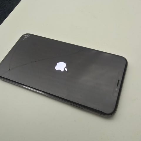 Apple iPhone XS Max smartphone med 256 GB intern lagring. Modellen har pekskärm över nästan hela framsidan och en svart baksida. Enheten lämpar sig för appar, surf, meddelanden, sociala medier och lagring av bilder, video och musik. Observera att baksidan på telefonen är sprucken enligt bilderna.