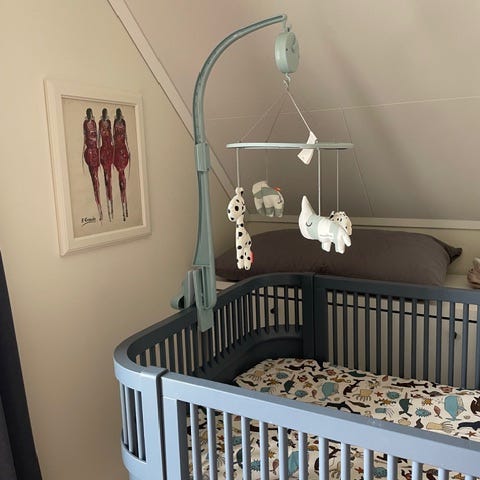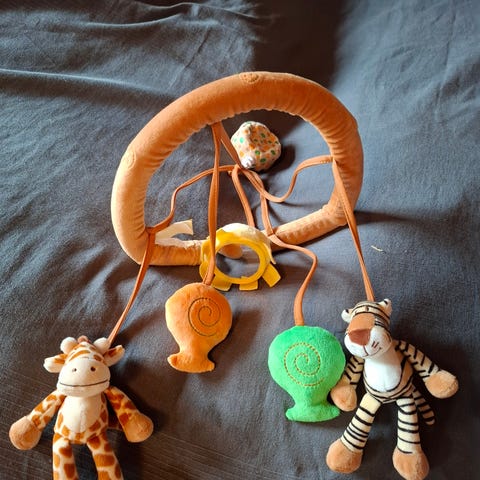 Done by Deer babymobil med mjuka djurfigurer i tyg. Mobilen har en rund ring med randigt mönster i grått och vitt samt flera hängande figurer i matchande färger. Fäste för montering på spjälsäng eller liknande ingår. Passar i barnrum eller vid spjälsäng som visuell stimulans för spädbarn.