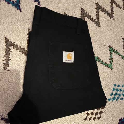 byxor för herr i storlek M. Byxorna är blå och tillverkade i bomull. De har flera fickor, inklusive bakficka med Carhartt-logga och benficka. Passar som vardags- eller arbetsbyxa beroende på behov.