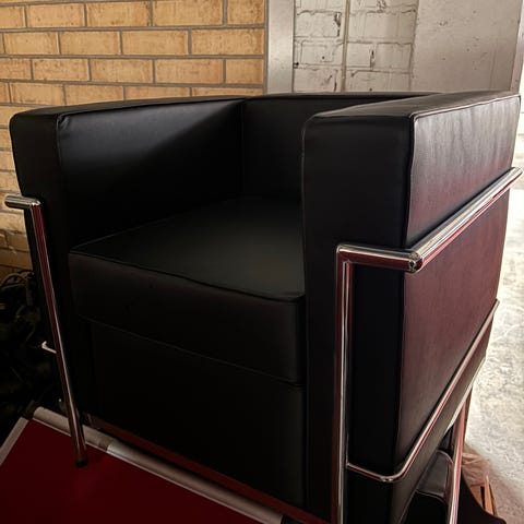 Barcelonafåtölj i mycket bra skick. Svart läder. Som ny. Finns även en fotpall i samma stil för 500 kr.