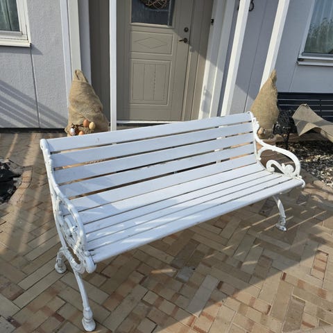 Trädgårdsbänk i trä med sidor och ben i gjutjärn. Bänken har ribbad trä sits och ryggstöd samt dekorativa gjutjärnsgavlar. Lämplig för placering i trädgård, på uteplats eller vid husvägg. Säljs i befintligt skick enligt bilder.