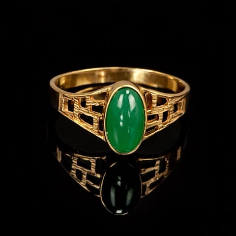 Ringen är uppbyggd kring en oval facetterad sten i vertikal placering. Stenen sitter i en slät, sluten infattning som bildar en tydlig kärna i mitten.