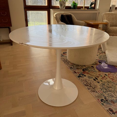 Fint, vitt pelarbord i behov av lite snickarkärlek. Ca 80-100 år gammalt. Ø90 cm, höjd 66 cm.