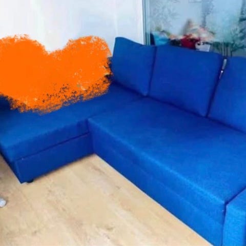 Säljer en hörnsoffa med möjlighet att öppna och stänga, som även kan användas som en säng att sova i. Det finns även plats under soffan för att förvara saker. Vänstra hörnet är skadat, vilket syns på bilden.