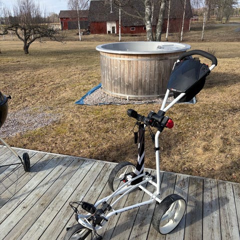 Mycket fin och smidig , 3 hjulet golfvagn i fint skick där allt fungerar som de ska. Går fälla ihop så den går in smidigt i ex bilen!