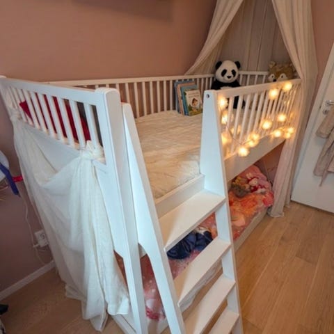 Säljer en oliver furniture Wood mini våningssäng inkl 2 madrasser. Lite lätt färgskav på vissa ställen och någon skavank förekommer men går enkelt att dutta på lite vit färg om man har det. I övrigt bra skick.