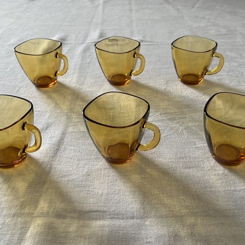 Säljer ett set om fyra tidlösa dricksglas från franska Vereco. Klassisk retrodesign i en vacker bärnstensfärgad ton som ger en härlig 70-talskänsla till dukningen.