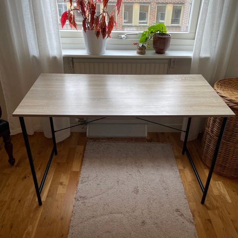 Fint skrivbord med vit skiva. Skrivbordet är just nu nedmonterat. Samtliga fyra ben finns med tillhörande skruvar.