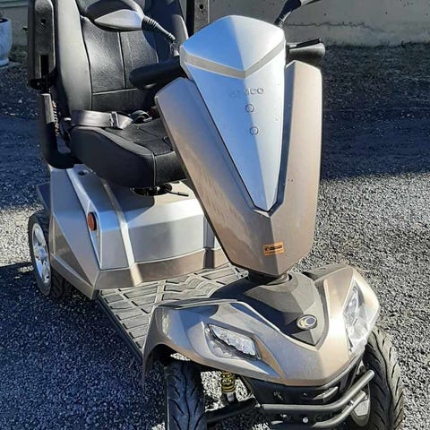 Elmoped med trehjulig design i röd färg. Utrustad med hög rygg, armstöd och bekväm sits. Mopeden har korg eller box baktill för förvaring samt fotplatta för stabilt insteg. Passar för persontransport på kortare sträckor på jämnt underlag. Drivs av elmotor och är avsedd för sittande förare. Tillverkad 2023.