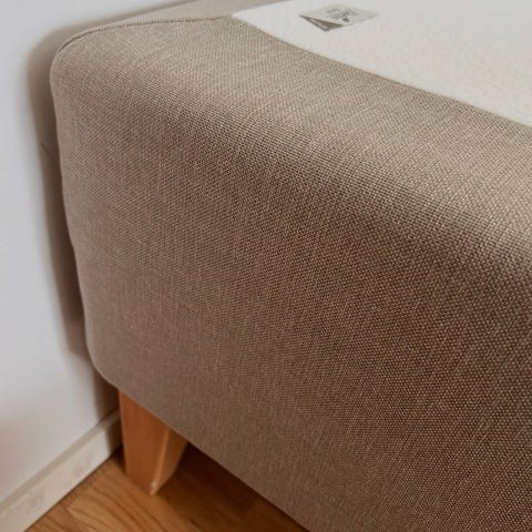 IKEA resårbotten med tillhörande vit bäddmadrass. Underdelen är klädd i grått tyg med rutmönster och står på fyrkantiga ben i ekträ. Bäddmadrassen är vit med lätt vadderad, quiltad ovansida. Passar som enkelbädd i sovrum, gästrum eller studentrum.