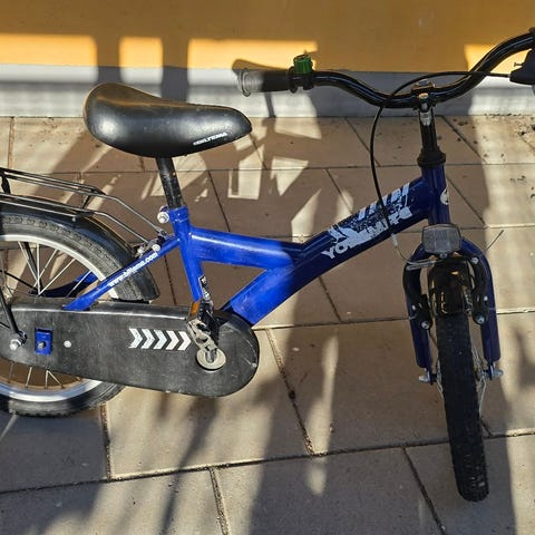 Barncykel med 16" hjul. Cykeln är röd med vit sadel och vita däck. Utrustad med framkorg, pakethållare bak och kedjeskydd. Säljer då våra tjejer vuxit ur den.
