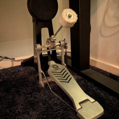 Robust bottenplatta med gummidyna och infällbara spikar så pedalen håller sig på plats. Hållare för drum-key + nyckel.