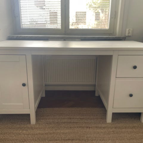 Bra gediget skrivbord med kabelgömmor skåp och lådor. Använts flitigt, en skada i sammanfogningen mellan delarna, se bild. Kan monteras ned i 3 delar o fraktas enkelt