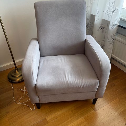 Fåtöljen är cirka 4 år gammal och har spår av användning.